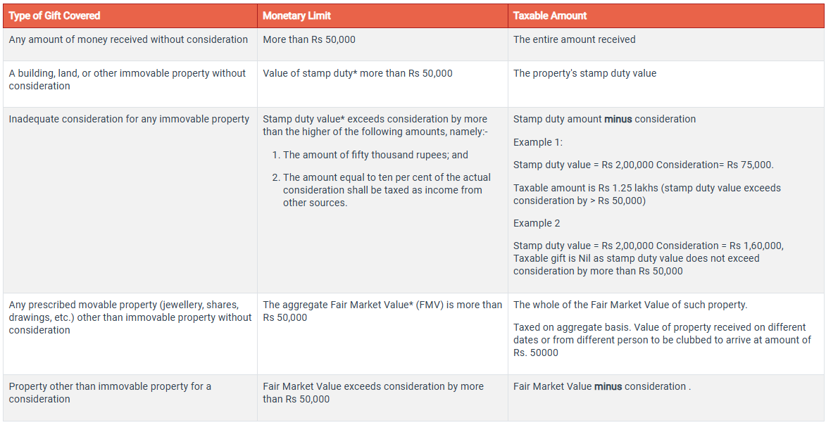 In the case, where the property is received without consideration (i.e., without payment) and the stamp duty value (i.e., value adopted by the authorities to calculate stamp duty) exceeds Rs 50,000 than the entire stamp duty value of the property is chargeable to tax .