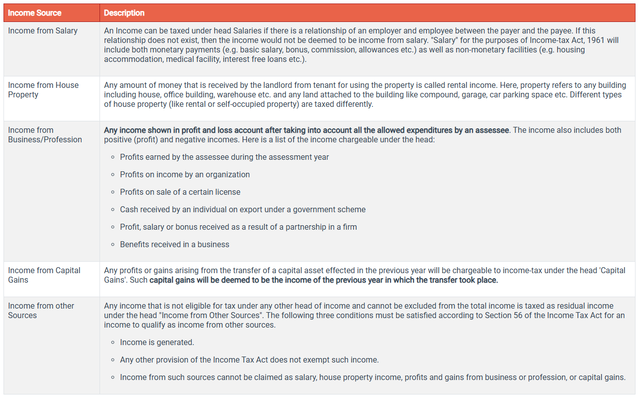 As per the income tax act 1961, assessee income is divided into 5 categories: