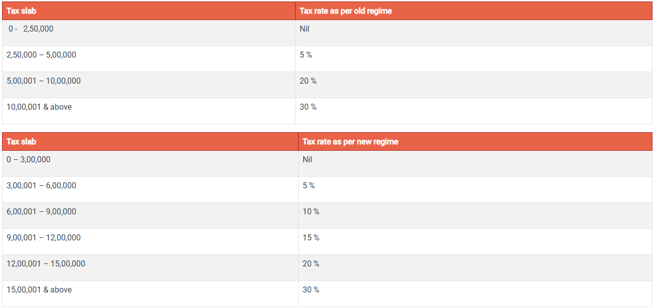 For an individual taxpayer under the age of 60, the following are the applicable tax rates/ tax slabs under the old tax regime and new tax regime. Any one of these two tax regimes can be opted by the taxpayer.