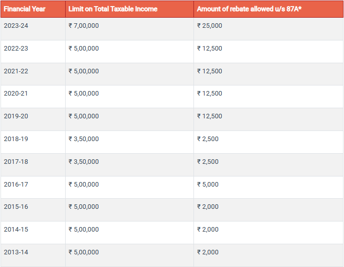 The Government of India from the Financial Year 2013-14 announced the tax rebate under Section 87A. Since then the limits have witnessed the following changes:
