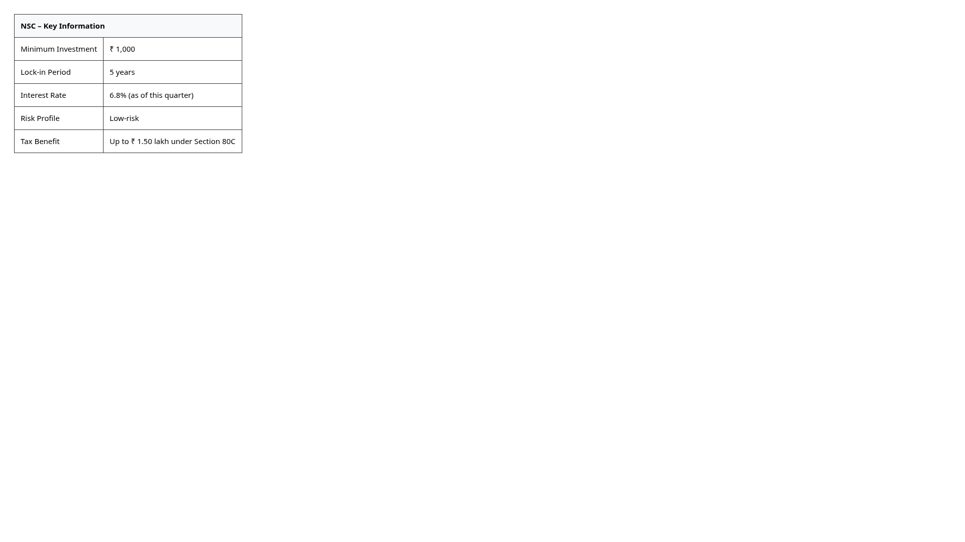 A government savings bond known as an NSC, or National Savings Certificate, is suitable for minor investments and tax relief. In order to help in nation-building, National Savings Certificates were initially established in the 1950s. The National Savings Certificate (NSC) is a fixed income investment scheme that you can open with any post office branch. The scheme is a Government of India initiative. It is a savings bond that encourages subscriber mainly small investors. NSC comes with a fixed maturity period of five years. There is no maximum limit on the purchase of NSCs, but only investments of up to Rs.1.5 lakh can earn you a tax break under Section 80C of the Income Tax Act. The certificates earn a fixed interest, which is currently at a rate of 6.8% per annum. The interest rate is revised on a regular basis by the government. Any resident of India may purchase these certificates from any post office inside the country. It is a government-supported, low-risk program with a set return rate. Investors who don't like taking chances or people who want to grow their customer through a guaranteed return program usually choose this.