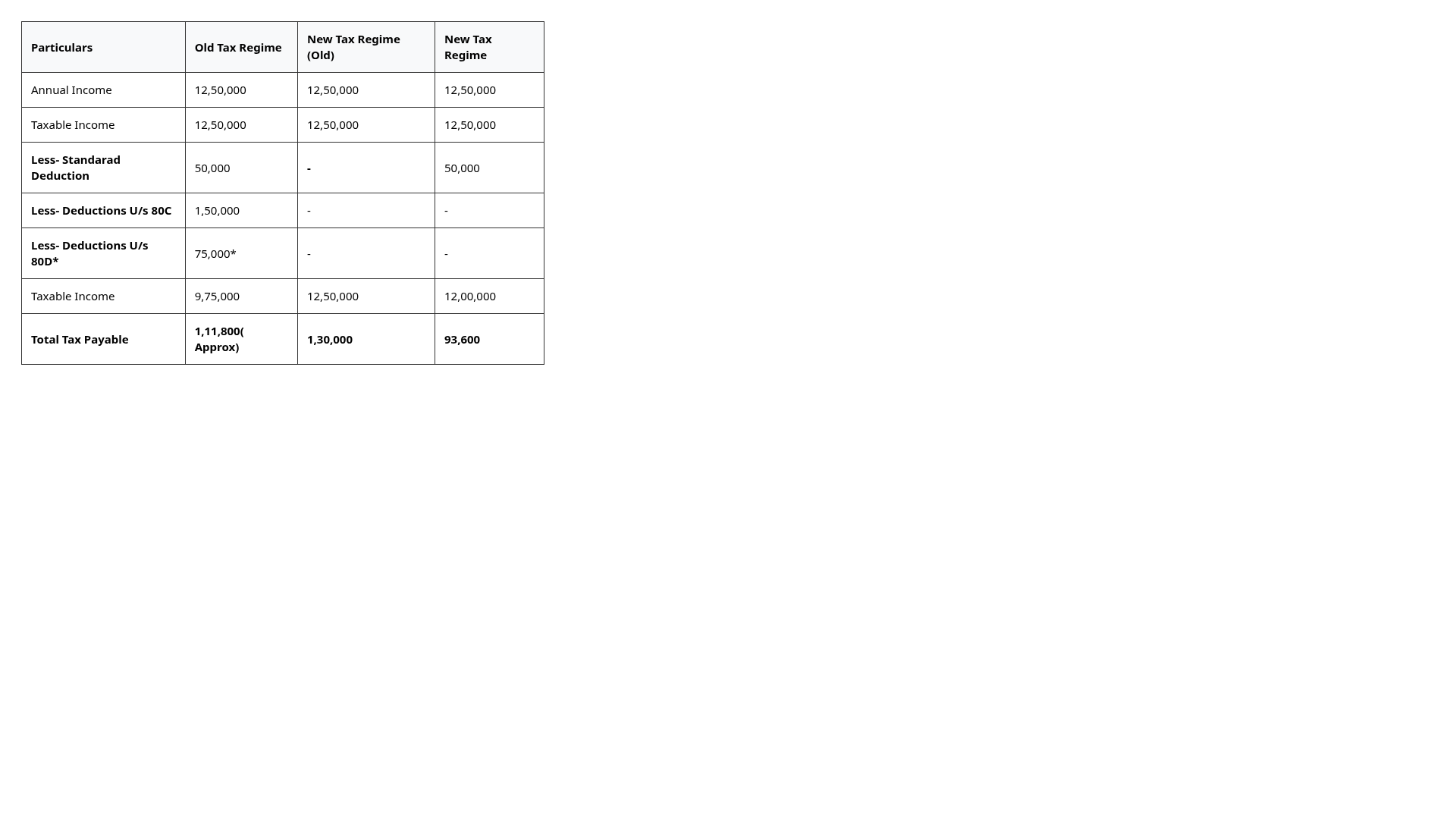 According to the tax slabs given above, the old tax regime rate is 30% and the new tax regime rate is 25% for a salary income of 12.5 lakhs. Let us now calculate the total tax due after taking into account the deductions allowed under the old tax regime.