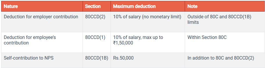 Note: With effect from 1 April 2019, the Central Government's contribution to NPS for its employees has been doubled to 14%. If your employer contributes to NPS and you do as well, you can take advantage of all three deductions indicated above to maximise your tax savings.