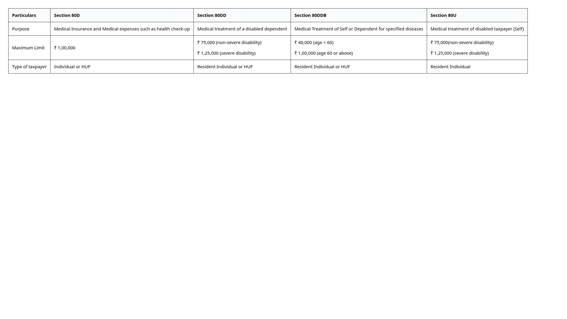 The difference between Sections 80D, 80DD, 80DDB and 80U are as follows: