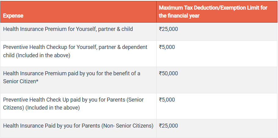 Under Section 80D, you are allowed to claim the health insurance premium for yourself and the family according to the limits stated in the table below: