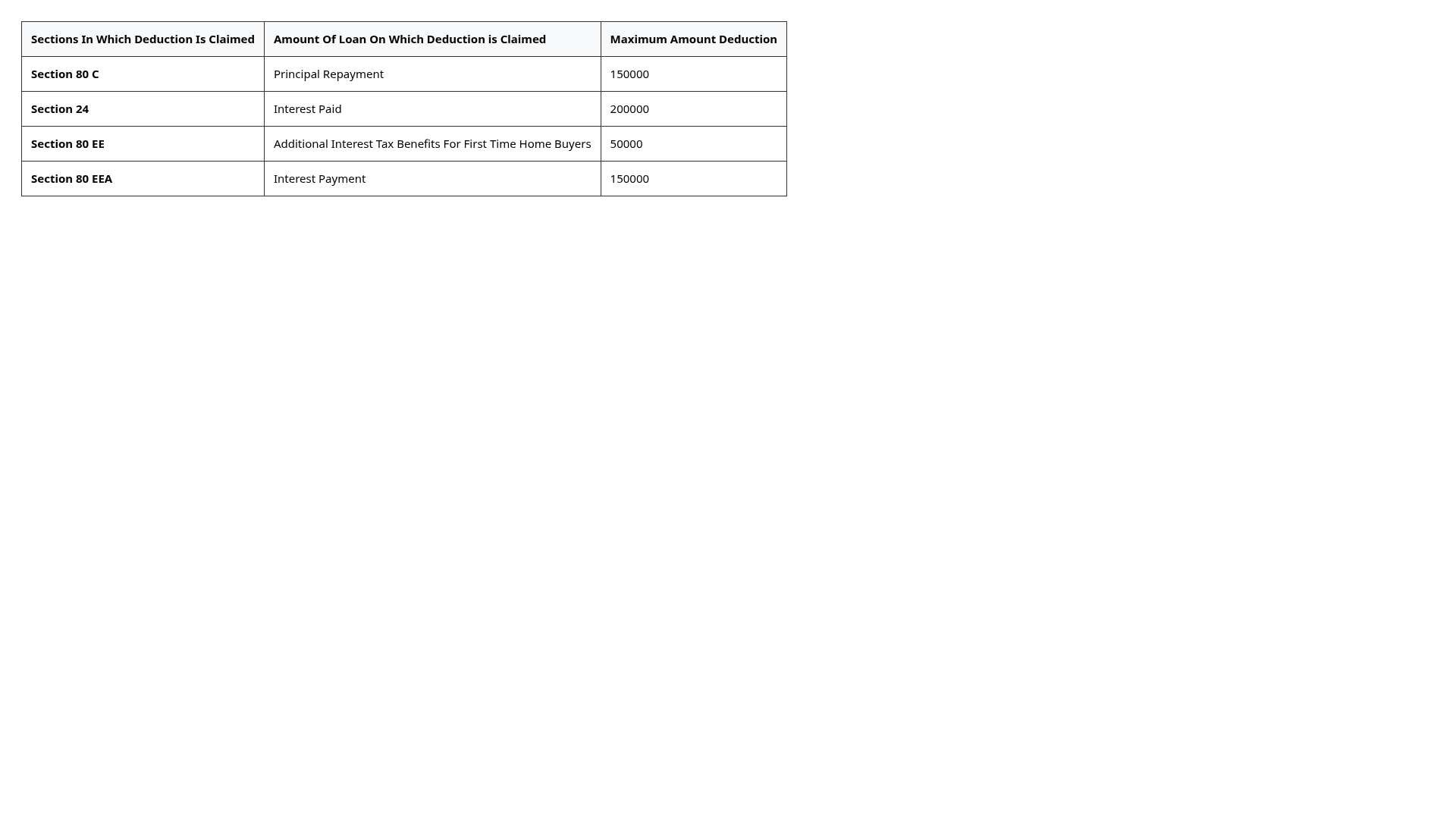 Section 80 EEA -Under this provision, you can claim a deduction for the interest you pay on your housing loan. If the loan had been taken out, it should have been used for acquisition of a Residential House. This section does not cover the construction of a Residential House. This section allows you to deduct up to Rs 1,50,000 per financial year